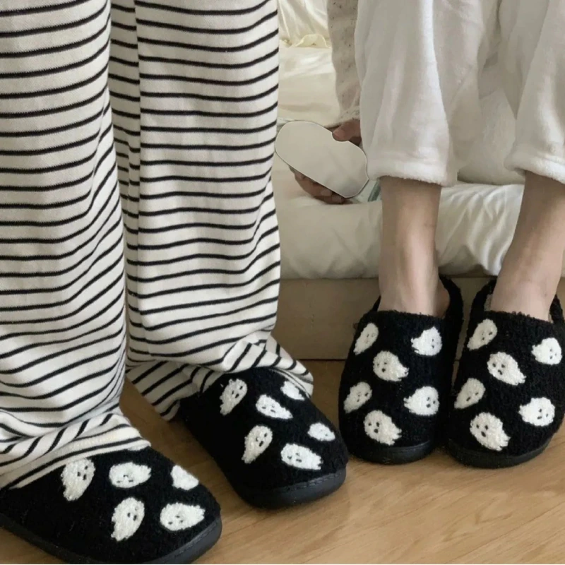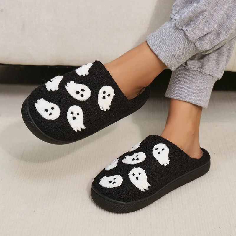 Pantoufles noires du 35 au 41, douces, moelleuses et bien chaudes, avec motifs fantôme blanc et semelle antidérapante, parfaites pour cocooner tout l’automne et l’hiver.