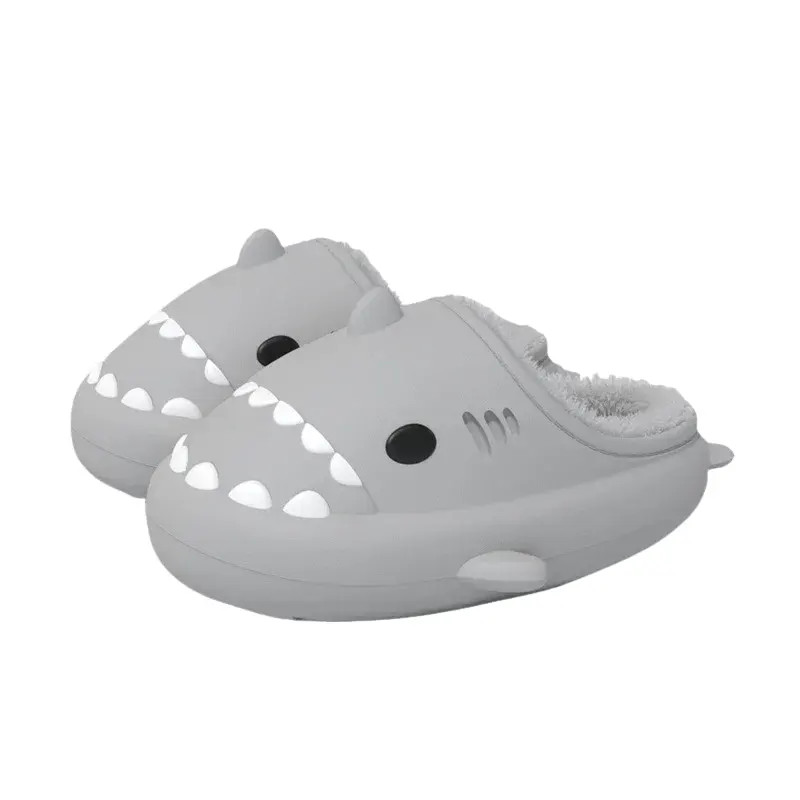 On est sur une paire qui assume : look requin (dents + nageoires + branchies), mais vibe “je suis un doudou déguisé”. L’extérieur en EVA rend la pantoufle légère, souple et résistante, et l’intérieur en peluche vous met directement en mode cocon même quand vous marchez comme si vous étiez en mission secrète vers le frigo.